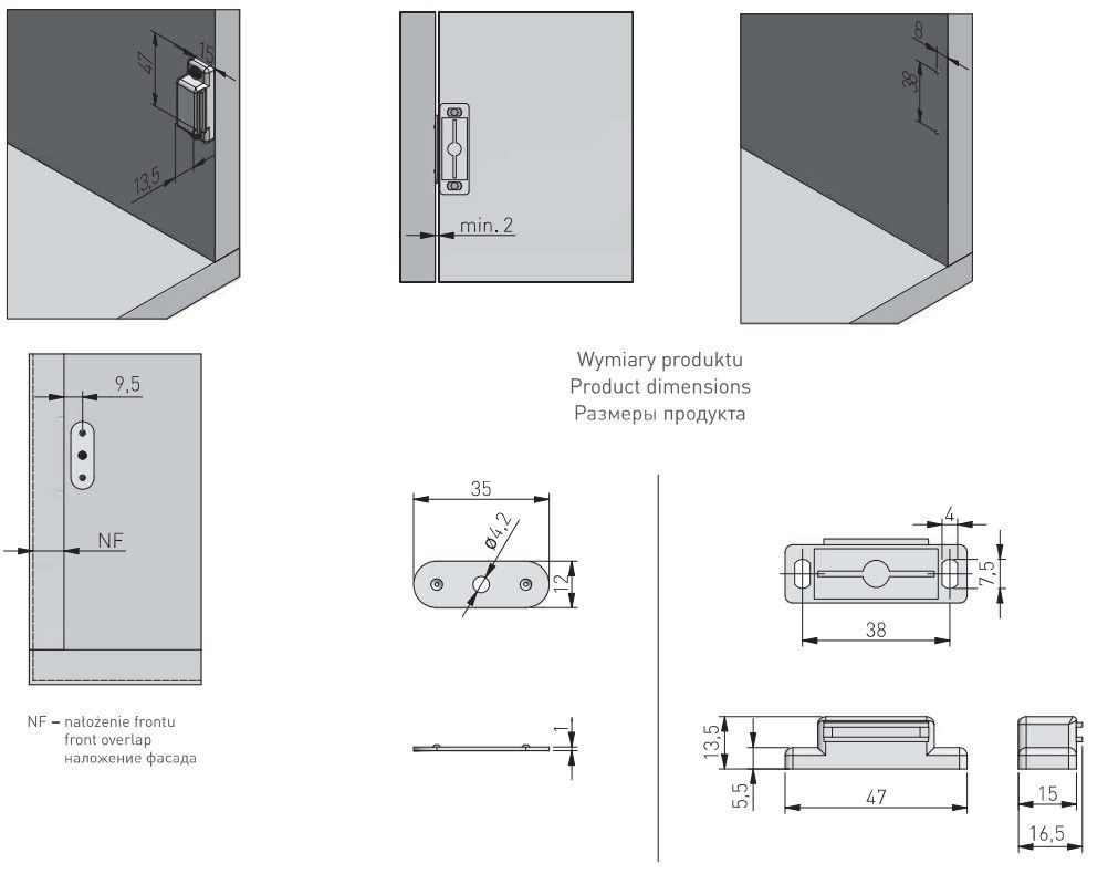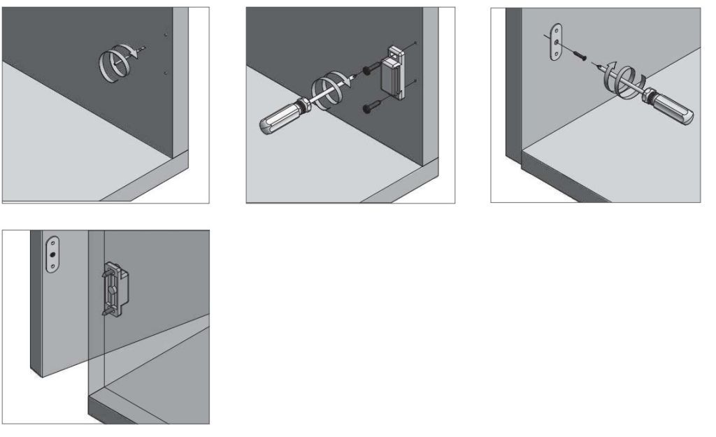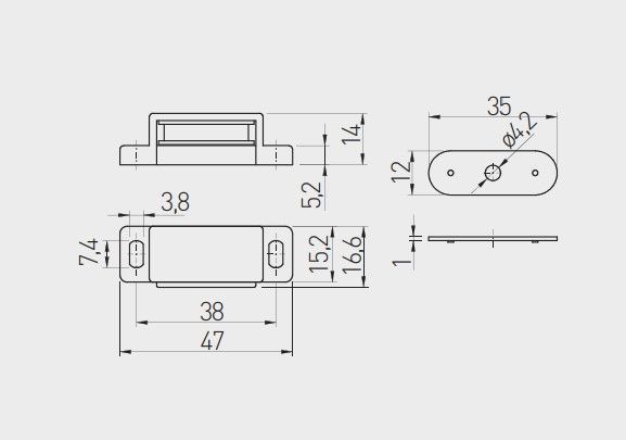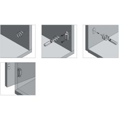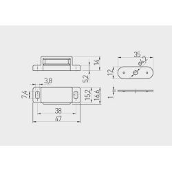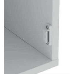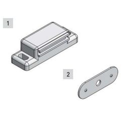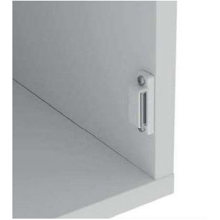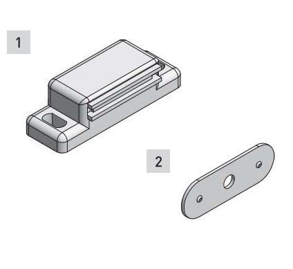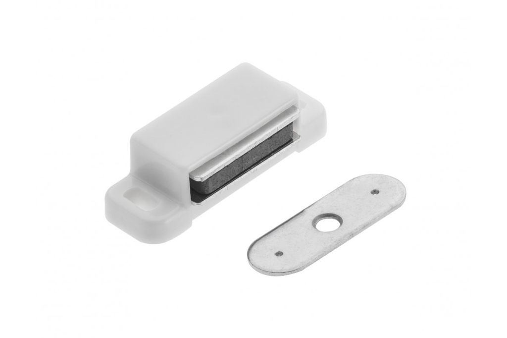 Nábytkový magnet v bílé barvě na skříňky. Pouzdro je vyrobeno z plastu. Součástí sady je i destička držící magnet po zavření čela.