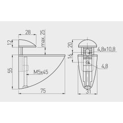 Univerzální stojan, vyrobený ze slitiny ZnAl. Určeno pro montáž dřevěných a skleněných polic. Maximální tloušťka police 25 mm, zatížení do 10 kg s délkou police 500 mm a šířkou 250 mm (poslední parametr závisí na počtu podpěr a materiálu police).