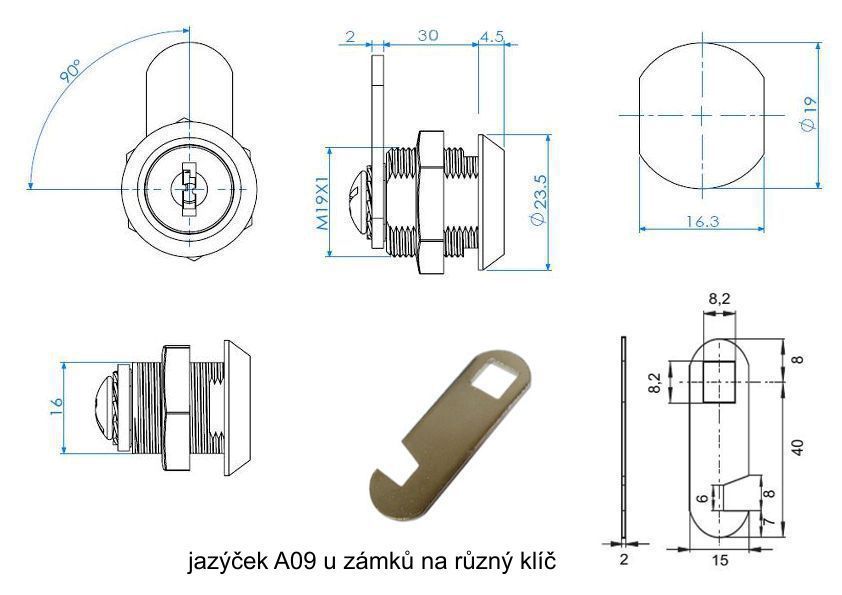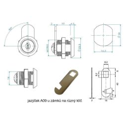 zámek, převlečná matice, 2ks klíče, jazýček A09-různý klíč, jazýček A01-stejný klíč, podložka, 2ks nylonová podložka