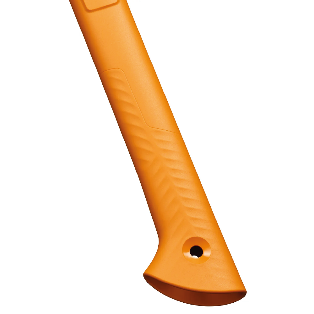 Oranžové topůrko je odolné a dobře viditelné. Ochranné pouzdro bezpečně chrání čepel sekery a nemusí se snímat, např. když zatloukáte do země kolíky ke stanu. Pouzdro má poutko na opasek a spolehlivý zajišťovací mechanismus.