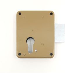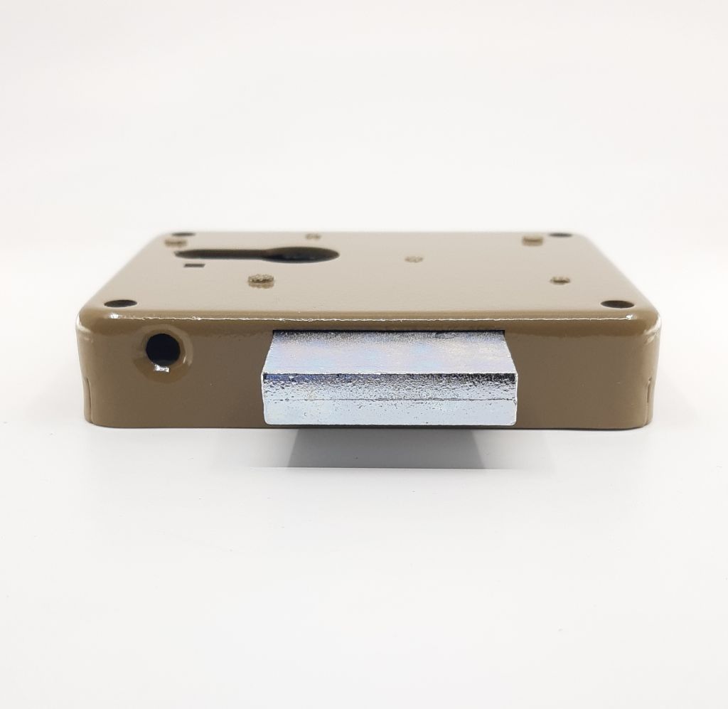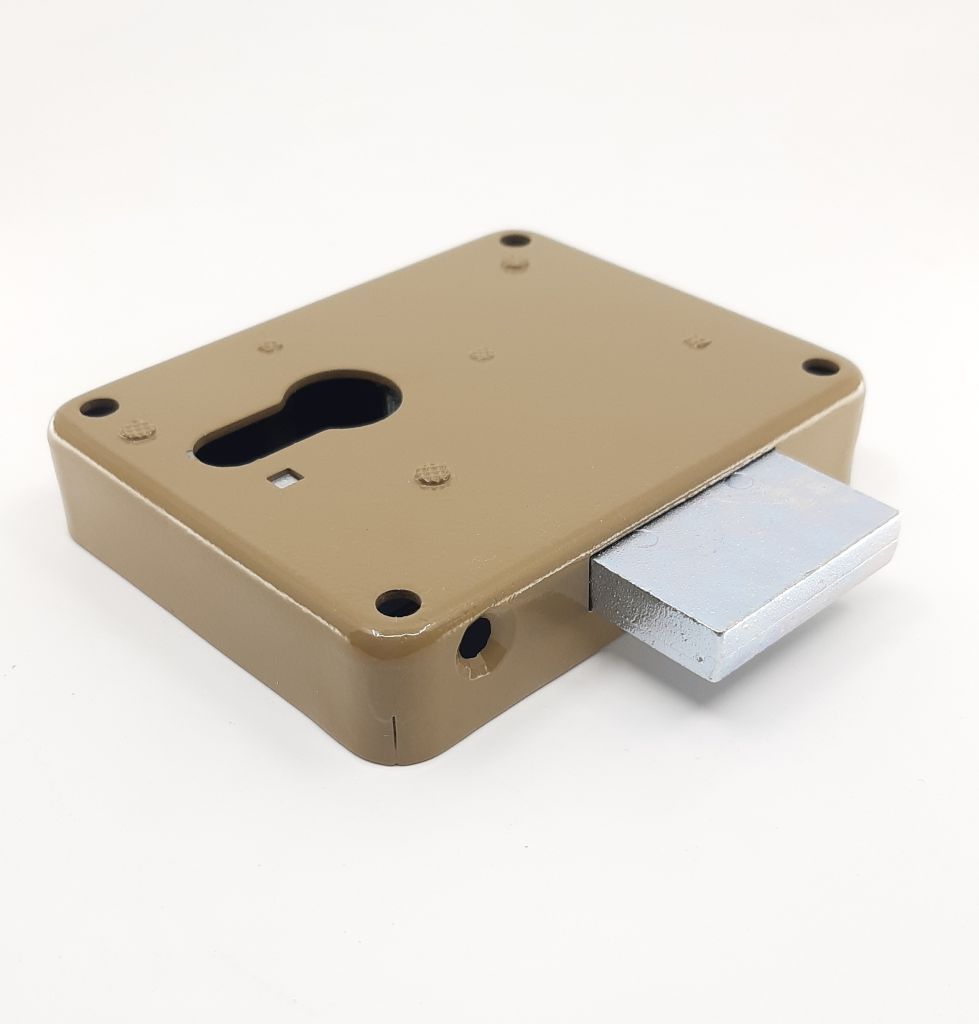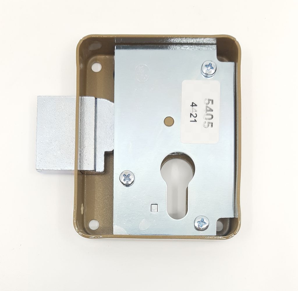 Speciální zámek k přišroubování na dveře. Vhodné k uzavření nenáročných úzkých dveřích v budovách, nebo k brance u zahrádek.