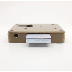 Pravý zámek při montáži (pohled) ze vnitř místnosti - závora vyjíždí v Pravo a závěsy dveří jsou v Levo.