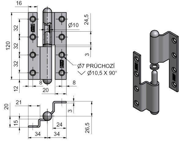 Závěs dveřní TKZ 120 Pravý lomený Mosaz 93100800