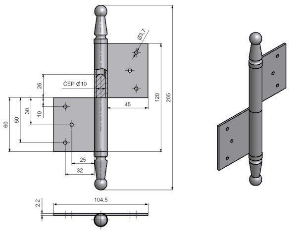 Čep závěsu je opatřen ozdobným ukončením UR01. Velmi vhodný při rekonstrukcích starých dveří.