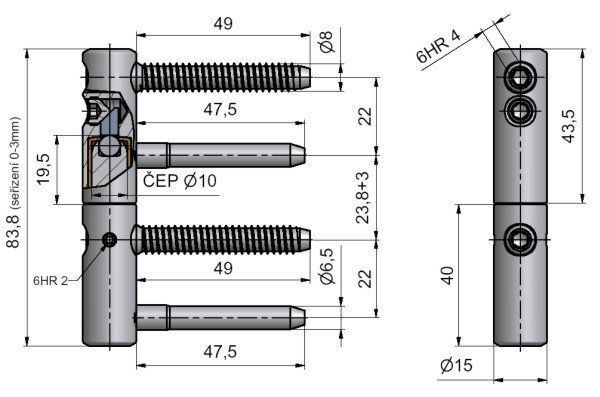 Kompletní závěs řady TRIO umožňující seřízení dveřního křídla ve třech směrech.