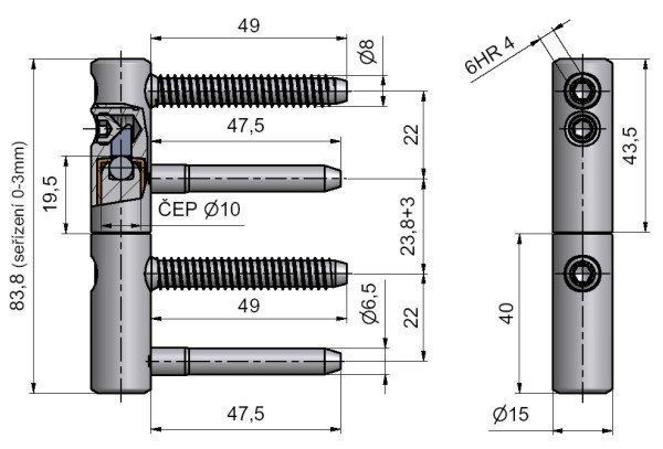 Kompletní dveřní závěs řady TRIO umožňující seřízení dveřního křídla ve třech směrech.