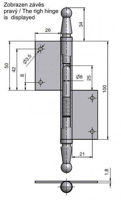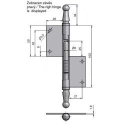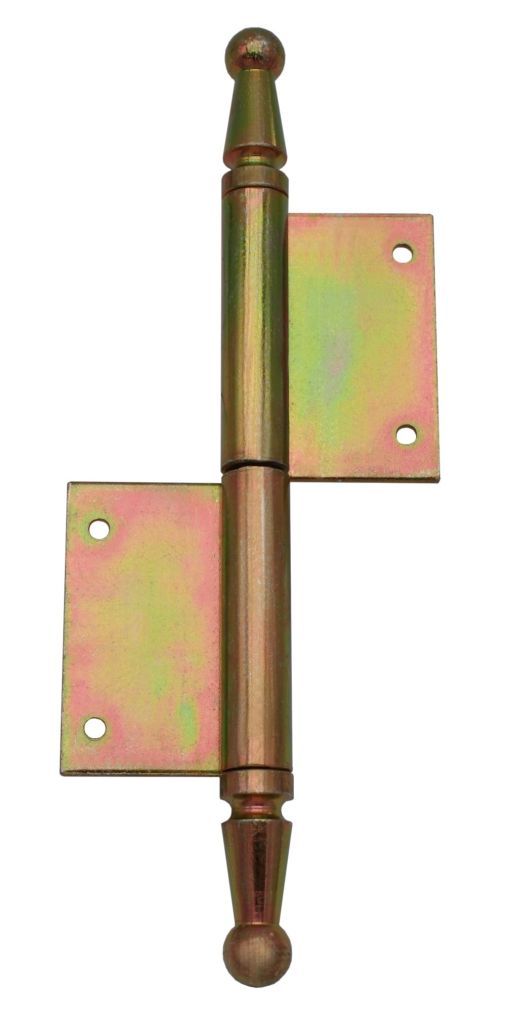 Závěs s ozdobným zakončením čepu. Používá se jako nosný závěs pro otočné spojení okenního křídla s rámem.
